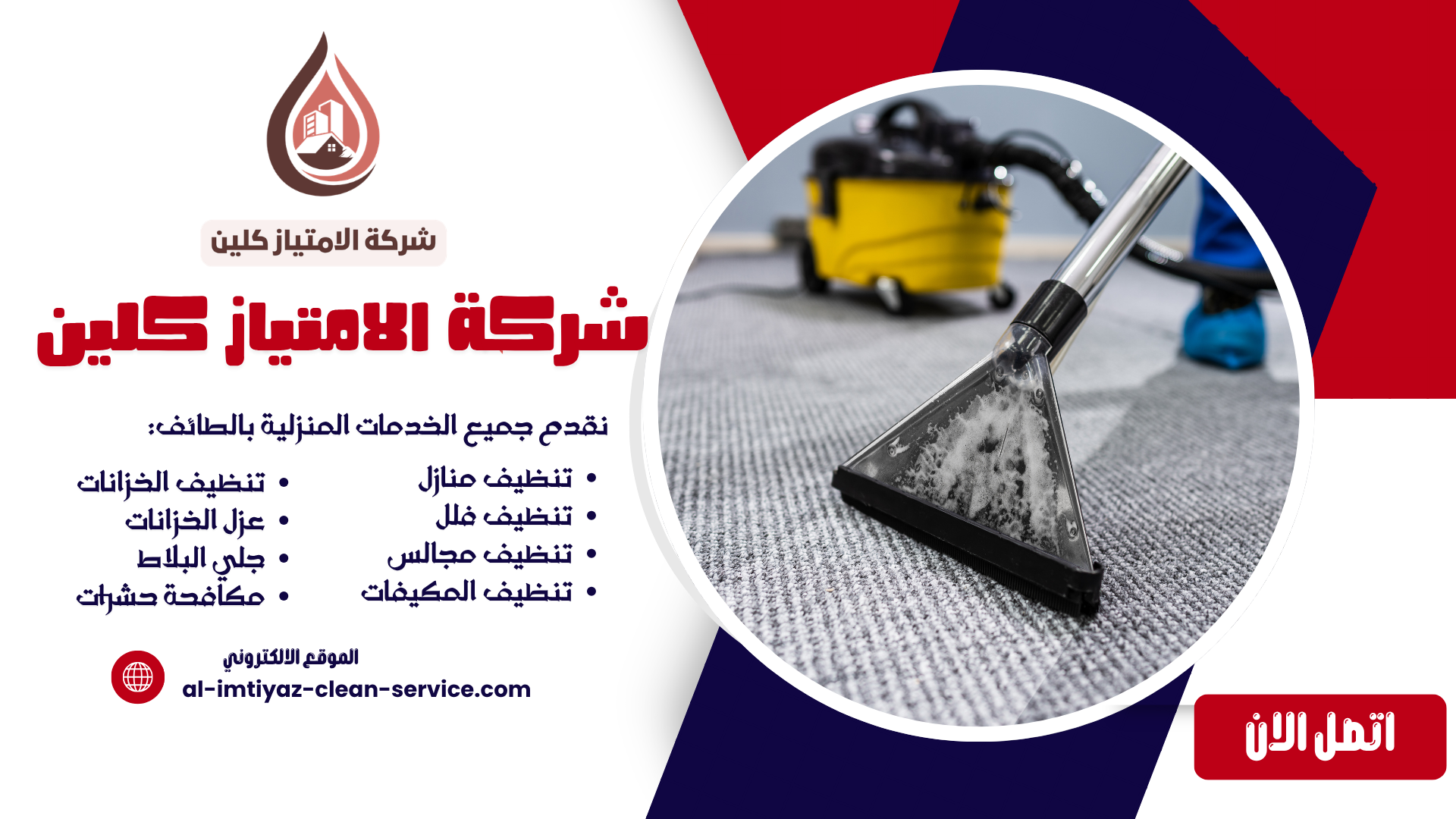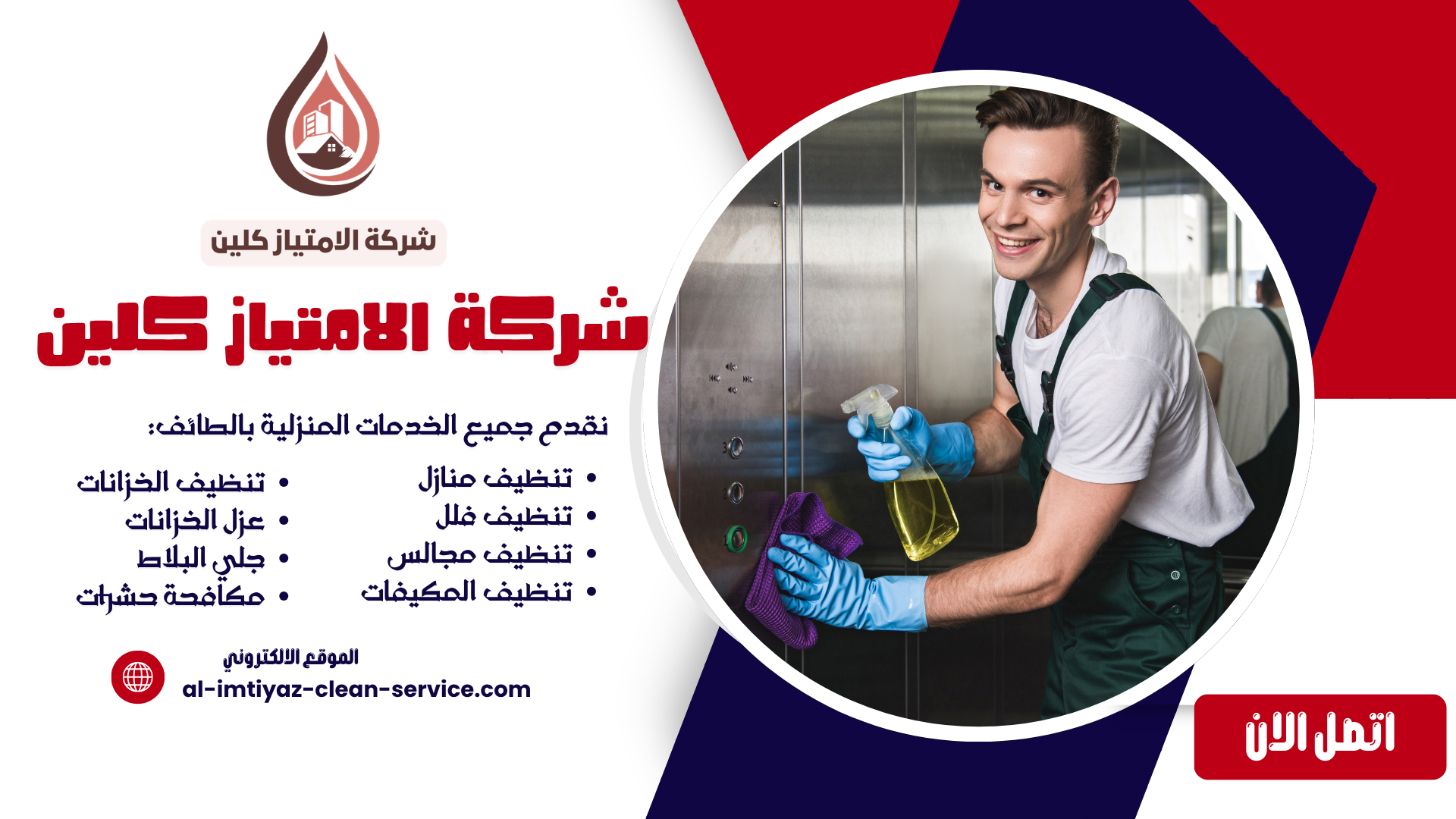 تُعد شركة الامتياز كلين واحدة من أبرز شركات التنظيف في مدينة الطائف، حيث تقدم خدمات احترافية متكاملة تشمل تنظيف المنازل، الفلل، الشقق، الخزانات، السجاد، الكنب، والمجالس باستخدام أحدث المعدات والتقنيات العالمية. نحرص دائمًا على تحقيق أعلى مستوى من النظافة والتعقيم لضمان بيئة صحية وآمنة لجميع عملائنا، مع الالتزام الكامل بالمواعيد وتقديم أفضل الأسعار التنافسية داخل الطائف وجميع أحيائها.