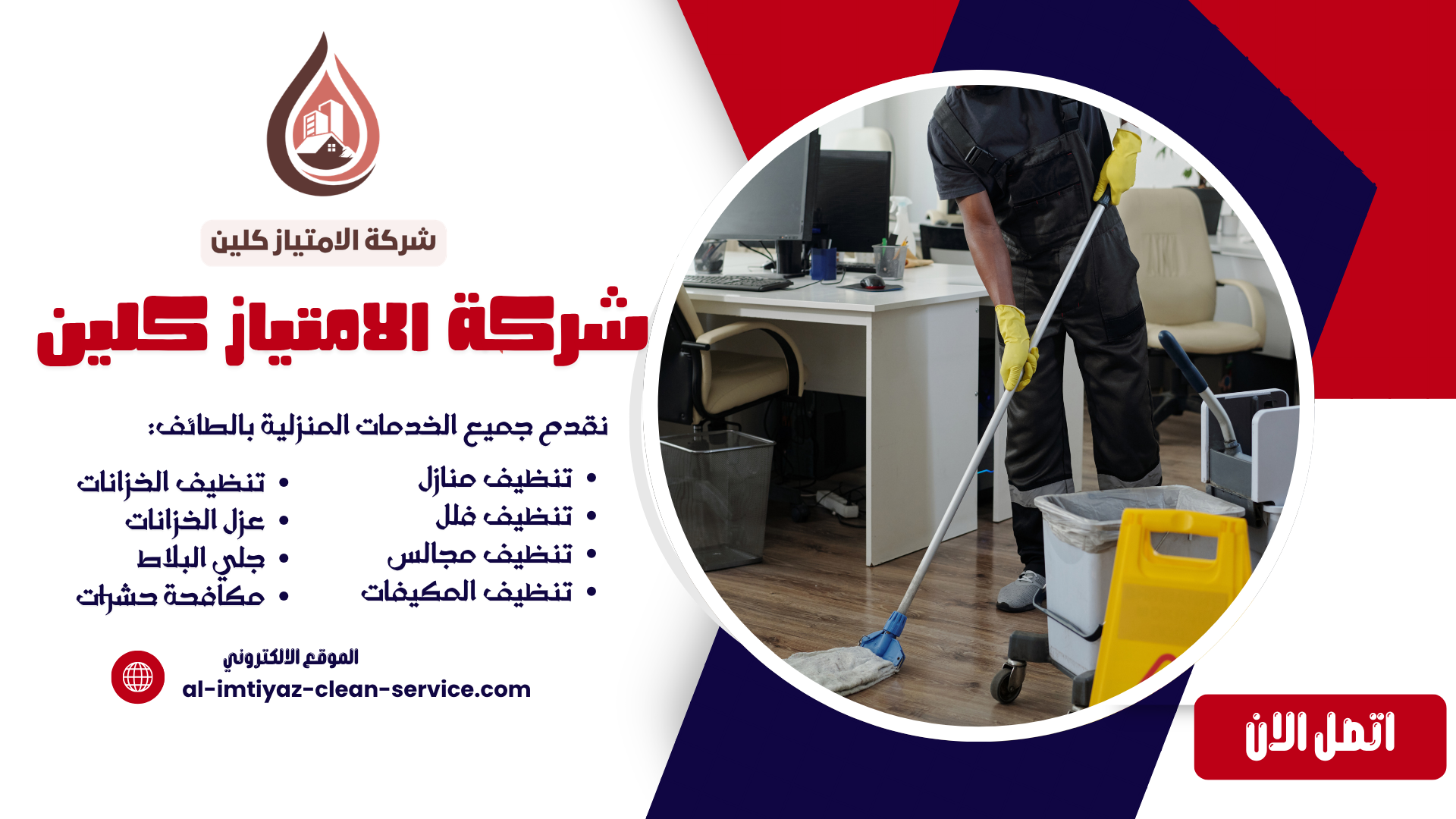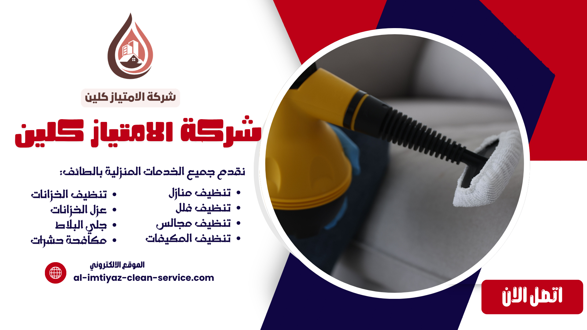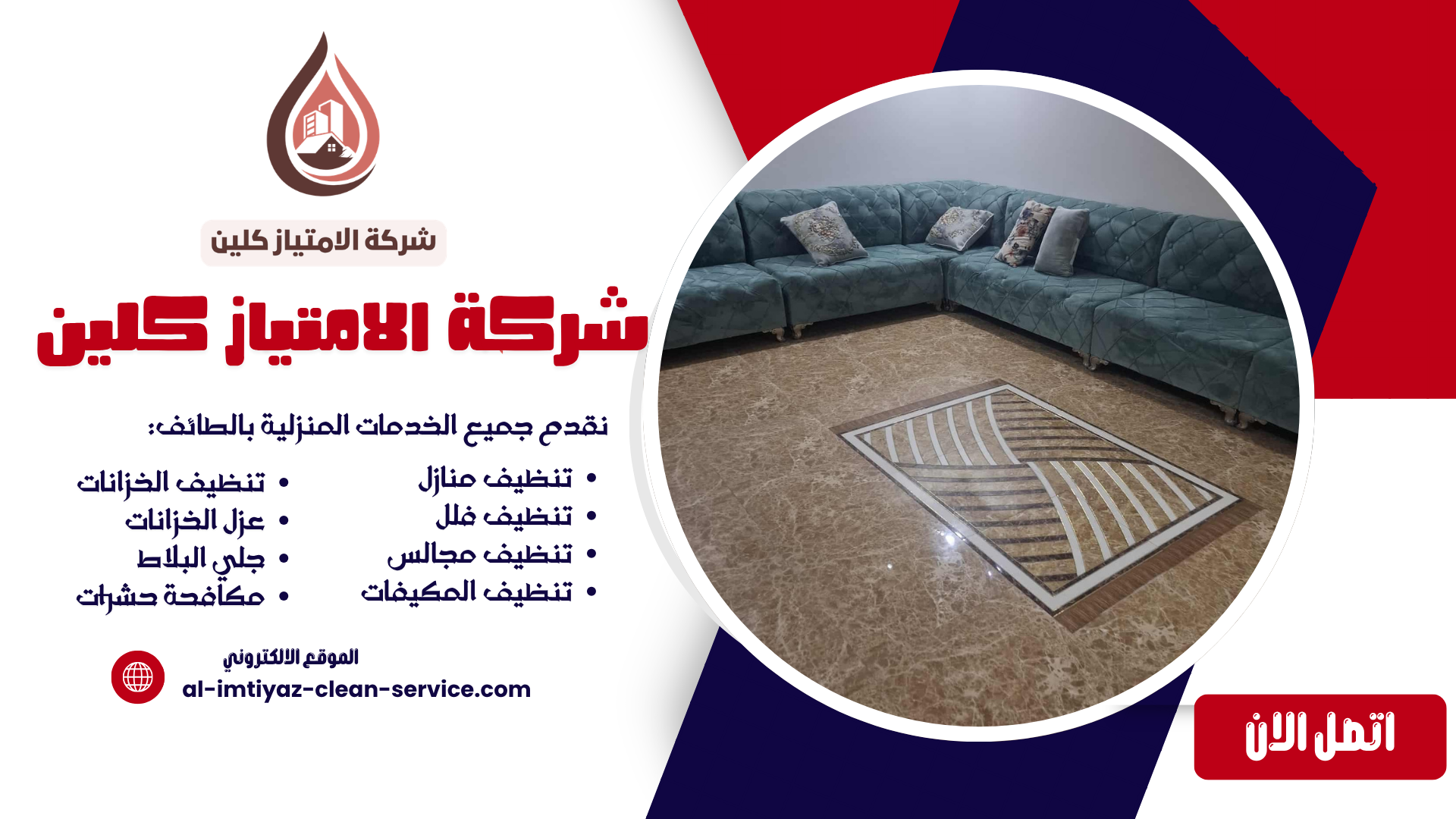 إذا كنت تبحث عن افضل شركة تنظيف بالطائف تقدم خدمات متكاملة بجودة عالية، فإن شركة الامتياز كلين هي الخيار المثالي، حيث نمتلك خبرة كبيرة في مجال التنظيف ونوفر فريق عمل مدرب على أعلى مستوى يستخدم أحدث أجهزة التنظيف بالبخار والتعقيم، مما يضمن إزالة الأوساخ العميقة والبقع الصعبة مع الحفاظ على سلامة الأثاث والأسطح، بالإضافة إلى تقديم عروض وخصومات مستمرة تناسب جميع العملاء.